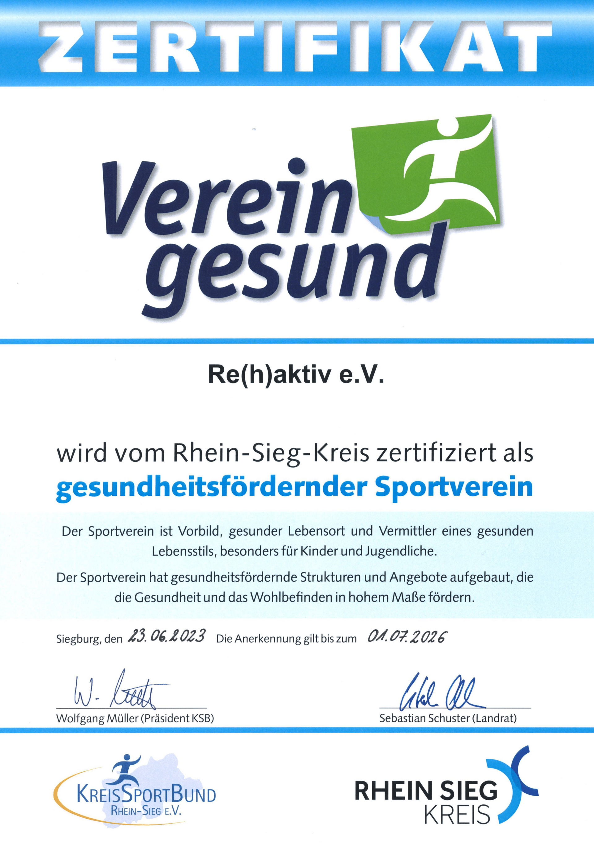 Als erster Sportverein 2020 wurde der Re(h)aktiv e.V. Mitte März 2020 als Gesundheitsfördernder Sportverein ausgezeichnet. Der Verein ist damit Vorbild, gesunder Lebensort und Vermittler eines gesunden Lebensstils, besonders für Kinder und Jugendliche. Der Verein hat gesundheitsfördernde Strukturen und Angebote aufgebaut, die die Gesundheit und das Wohlbefinden in hohem Maße fördern.
